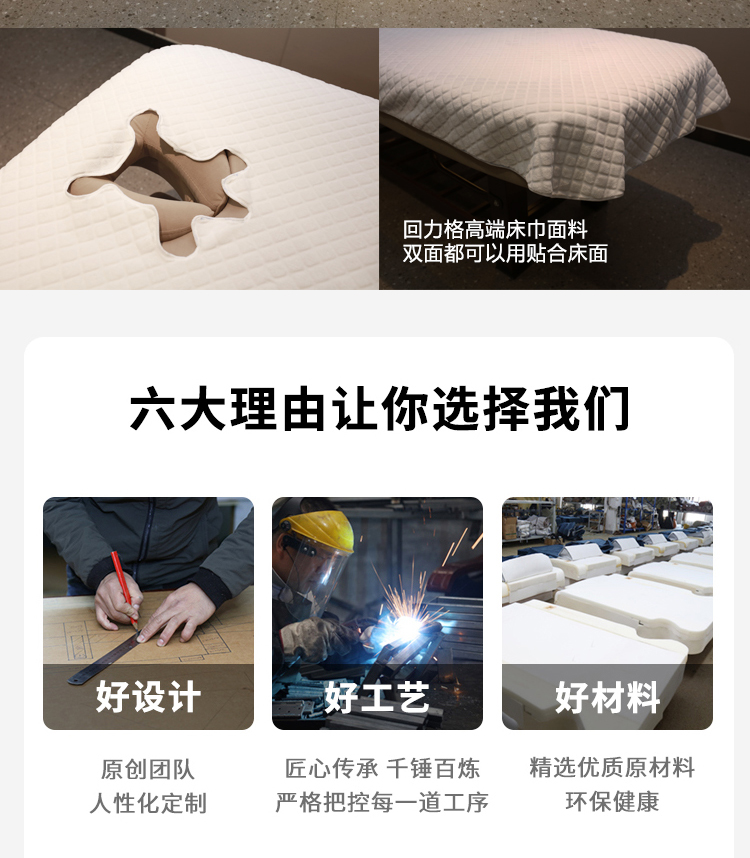 材质:绒布绗缝、烤漆钢架结构、高密海绵、实木板材